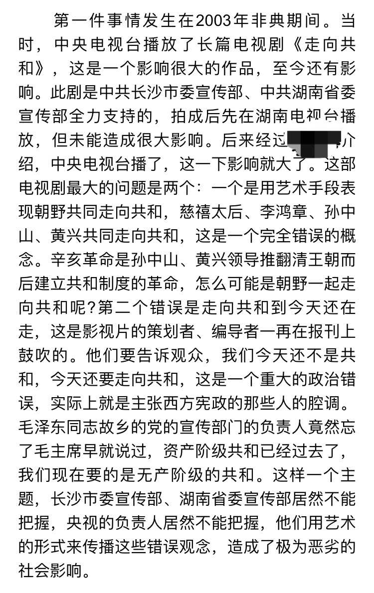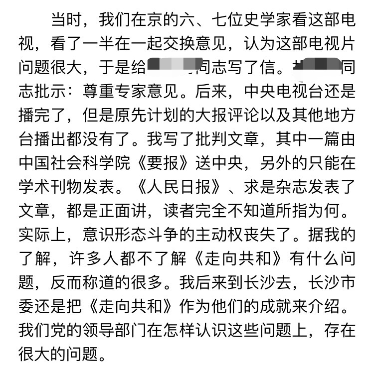 此文作者张海鹏,是社科院学部委员、曾任中国史学会会长,文中提到的名字(也就是我打马赛克的部分)层级非常高,想来这篇文章应该没有撒谎。所以事情很清楚了:《走向共和》确确实实被禁了,而且确确实实是因为政治不正确而被禁的。